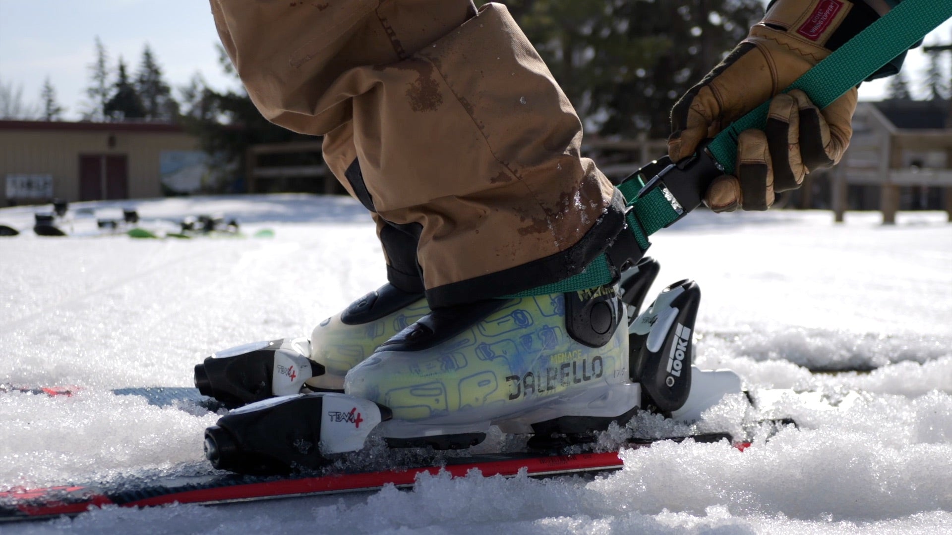 Clip control tether to ankle strap via thet ether buckle. The grown-up and the little one connect making one big, long skier. Unclip tether buckle before loading every ski lift.